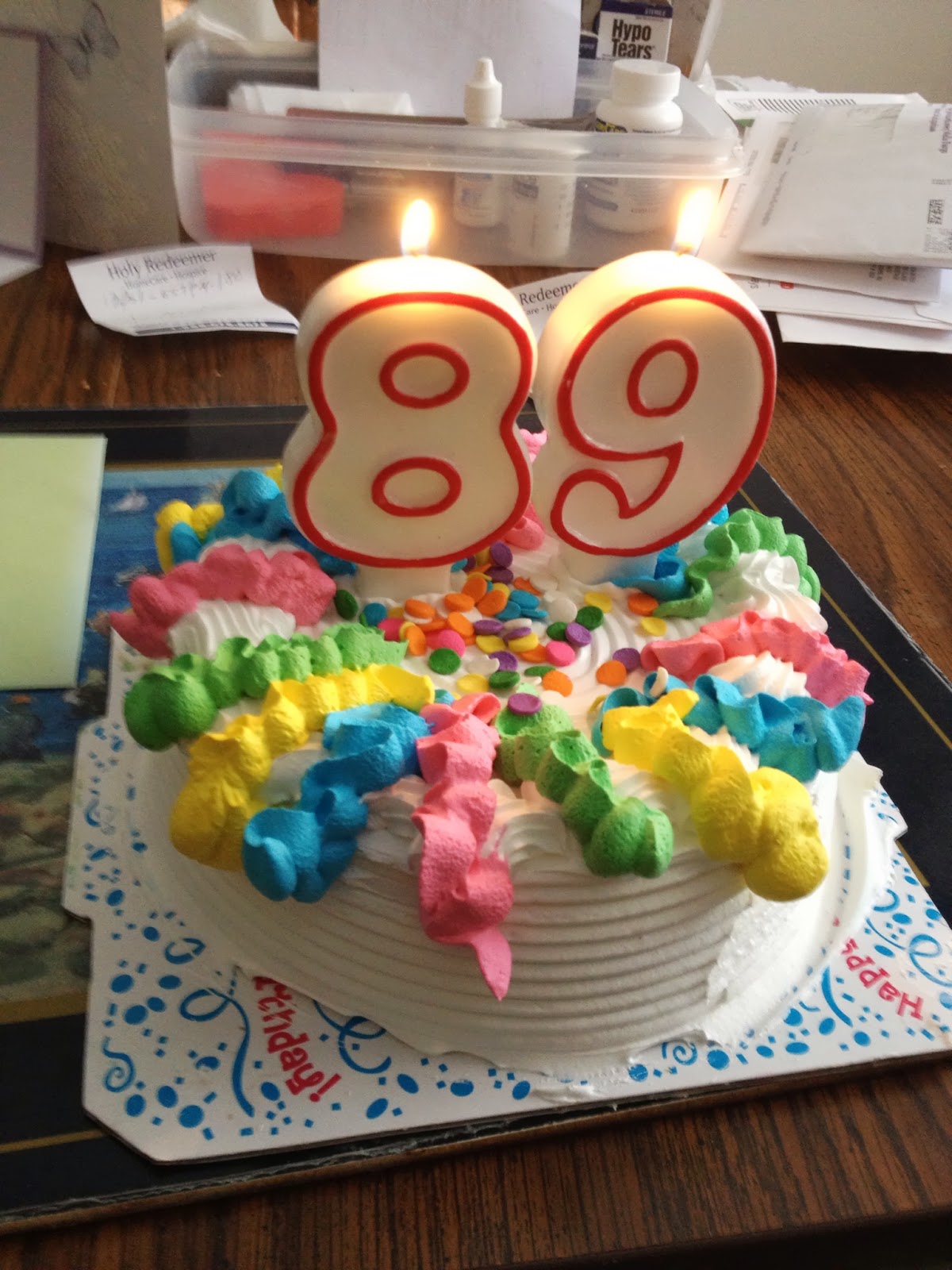 The two most recent visits I had with her were particularly memorable. When she turned 89 last year she insisted that we not make a fuss about it, as usual. So, of course, my mom and I did the opposite. We decorated her house while she was at ceramics class. There were streamers and balloons everywhere. When we brought her home from class, she was stunned, but I could tell she got a real kick out of it. We had cake and sang happy birthday.